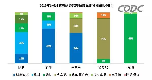 在媒体投放上,各品牌虽投放偏好不同,但都主要面向主流消费群体。其中,伊利主推经典有机奶,侧重投放机场媒体,面向高端消费人群。蒙牛主打的特仑苏牛奶偏爱投放楼宇液晶,光明奶则集中投放地铁媒体,两品牌均精准面向主流消费人群。