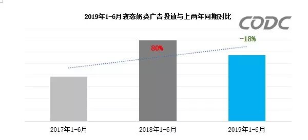 中天数据显示,近三年上半年,液态奶广告投放起伏较大,2018年上半年液态奶广告同比增长80%,今年有所降温,蒙牛广告的大幅减投,导致投放量同比下滑18%。
